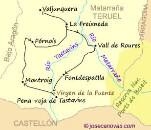 Nuestro alojamiento en el Matarraña se hallaba al sur de la comarca, en Peñarroya o Pena-roja de Tastavins, uno de los muchos pueblos de la zona que se fundaron en época medieval.